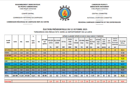 Rappelons que des 9 arrondissements de la Lékié, Evodoula vient en tête avec un score de 95,69% des suffrages en faveur de Paul Biya à l’élection présidentielle du 12 octobre 2025. La Commission régionale de campagne RDPC du Centre qui vient de publier les tendances des résultats dans le département de la Lékié indique également que l’arrondissement d’Evodoula affiche aussi le plus bas niveau d’abstention qui se situe à 2221 sur 9424 inscrits. Le RDPC enregistre ainsi tandis que les bulletins nuls après dépouillement dans les urnes sont de 63. Le taux de participation à Evodoula est de 76,43%. Evodoula est talonnée par Elig-Mfomo qui affiche un score de 94,30% avec 2295 abstentions sur 8264 inscrits. Sur 5969 votants, le RDPC a enregistré à Elig-Mfomo 5574 voix, soit un taux de participation de 72,23% et 58 bulletins nuls. Une performance également dans ce rare arrondissement où le RDPC a souvent fait face à l’opposition notamment le PDC, (le Parti Démocrate Camerounais).
